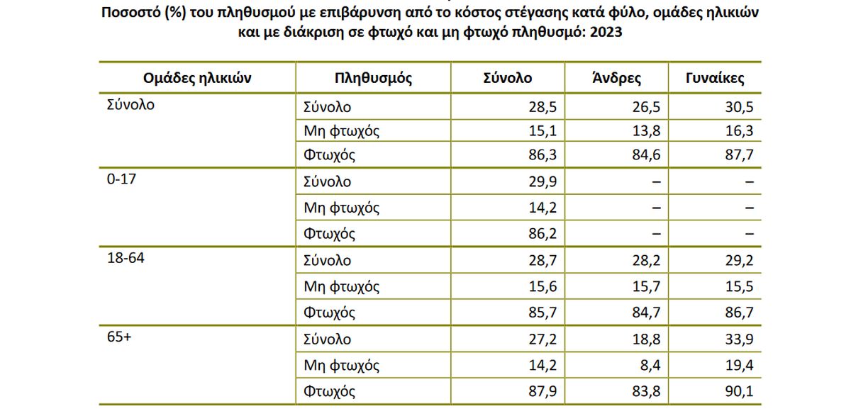 Ας σημειωθεί ότι το μεγαλύτερο πρόβλημα από την επιβάρυνση του κόστους στέγασης έχουν οι ηλικιωμένες γυναίκες (+65 ετών) στον φτωχό πληθυσμό, αφού το δηλώνουν σε ποσοστό 90,1%.