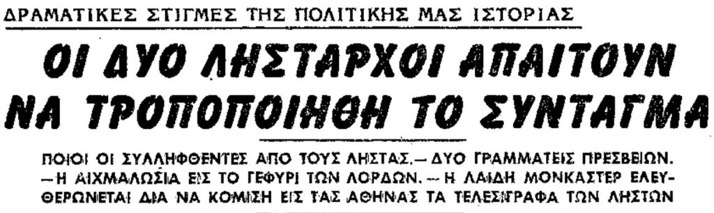 «Το τελεσίγραφο που είχε λάβει (σ.σ. το υπουργικό συμβούλιο) από τους ληστάς δεν μιλούσε μόνο για “ξαγορά 25.000 λιρών” αλλά επρόσθετε και ταύτα – γραμμένα με μολύβι σ’ ένα βρώμικο χαρτί: “Απαιτούμε απ’ την ελληνική Κυβέρνησι αμνηστία και να πάψη η εναντίον μας καταδίωξι, όχι μόνον εις Αττικήν, αλλά και εις όλες τις επαρχίες”.