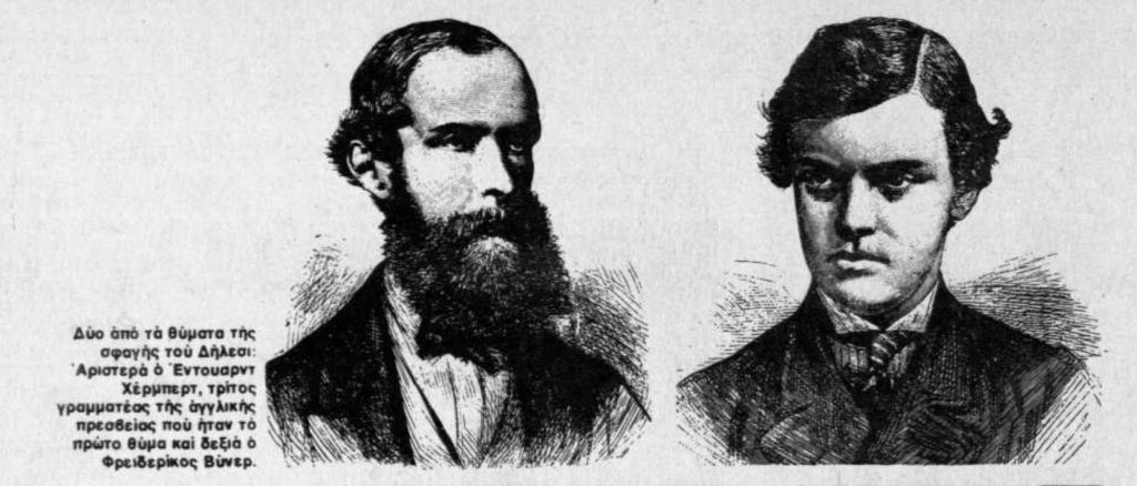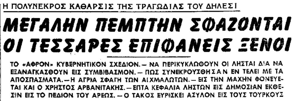 »Άλλωστε δεν επέζησαν πολλήν ώραν. Ξαφνικά ο Τάκος Αρβανιτάκης έδωσε την μοιραία διαταγή του φόνου των. Τον γραμματέα της Αγγλικής πρεσβείας Έρμπερτ έσφαξε με τα ίδια του τα χέρια ο Χρήστος Αρβανιτάκης.