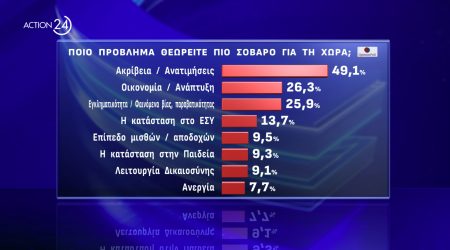 Σοβαρότερο πρόβλημα για τη χώρα, σύμφωνα με τους πολίτες, θεωρείται η ακρίβεια, με ποσοστό 49,1%, ενώ ακολουθούν η οικονομία/ανάπτυξη με 26,3% και η εγκληματικότητα, βία και παραβατικότητα, με 25,9%.