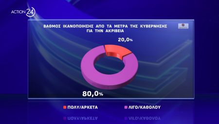 Λίγο ή καθόλου ικανοποιημένοι με τις επιδόσεις της κυβέρνησης του Κυριάκου Μητσοτάκη στο πεδίο της εγκληματικότητας και σε εκείνο της ακριβείας δηλώνουν οι πολίτες σε ποσοστό 80%, ενώ αρκετά ή πολύ ικανοποιημένο δηλώνει το 19% και 20% αντίστοιχα.