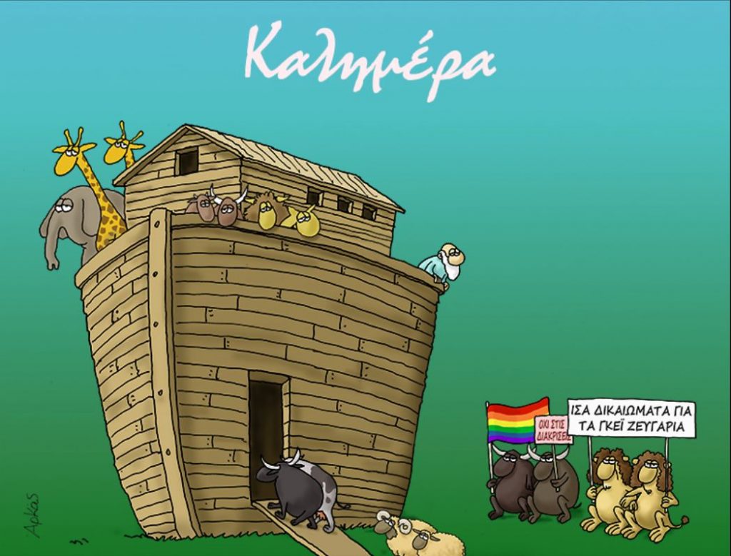 «Φωτιές» ανάβει σήμερα ο Αρκάς με την «Καλημέρα» του. Στο σημερινό του σκίτσο – που θα εγείρει πολλές αντιδράσεις – απεικονίζει τη γνωστή κιβωτό του Νώε και θίγει το ζήτημα των διεκδικήσεων της κοινότητας ΛΟΑΤΚΙ για ισότητα σε όλα τα πεδία.