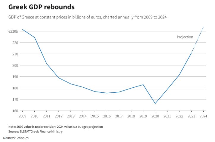«Πριν από μια δεκαετία, η Ελλάδα βρισκόταν στη δίνη μιας καταστροφικής κρίσης χρέους που χαρακτηρίστηκε από χρόνια λιτότητας, κακουχιών και αναταραχών. Τώρα, αξιωματούχοι και επενδυτές λένε ότι το 2024 θα μπορούσε να είναι η χρονιά που θα ολοκληρωθεί τελικά η ανάκαμψή της».