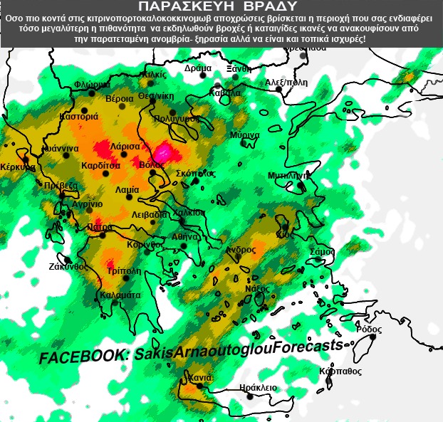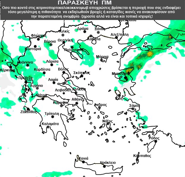 γ. Τις βραδινές ώρες τα φαινόμενα θα επεκταθούν ανατολικότερα και θα επηρεάσουν περιοχές της κεντρικής και της ανατολικής Μακεδονίας (ν. Πιερίας, ν. Θεσσαλονίκης, ν. Χαλκιδικής καθώς και στα θαλάσσια – παραθαλάσσια του ν. Σερρών και ν. Καβάλας), την ανατολική Στερεά, τις Σποράδες, την Εύβοια, τις Κυκλάδες και τα νησιά του ανατολικού Αιγαίου.