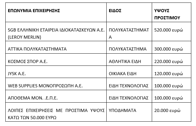 Σύμφωνα με τις διατάξεις του άρθρου 13α του ν. 2251/1994, περί ανακοίνωσης των επωνυμιών των επιχειρήσεων στις οποίες επιβλήθηκε πρόστιμο ύψους μεγαλύτερου από 50.000 ευρώ επιβλήθηκαν τα ακόλουθα πρόστιμα: