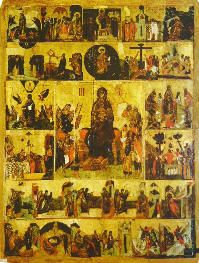 Ο Ακάθιστος Ύμνος, ρωσική εικόνα του 14ου αιώνα. Στο κέντρο εικονίζεται η Παναγία, ενώ καθεμιά από τις μικρές περιφερειακές εικόνες αφορά τη διήγηση ενός από τους 24 «οίκους» του Ακαθίστου Ύμνου