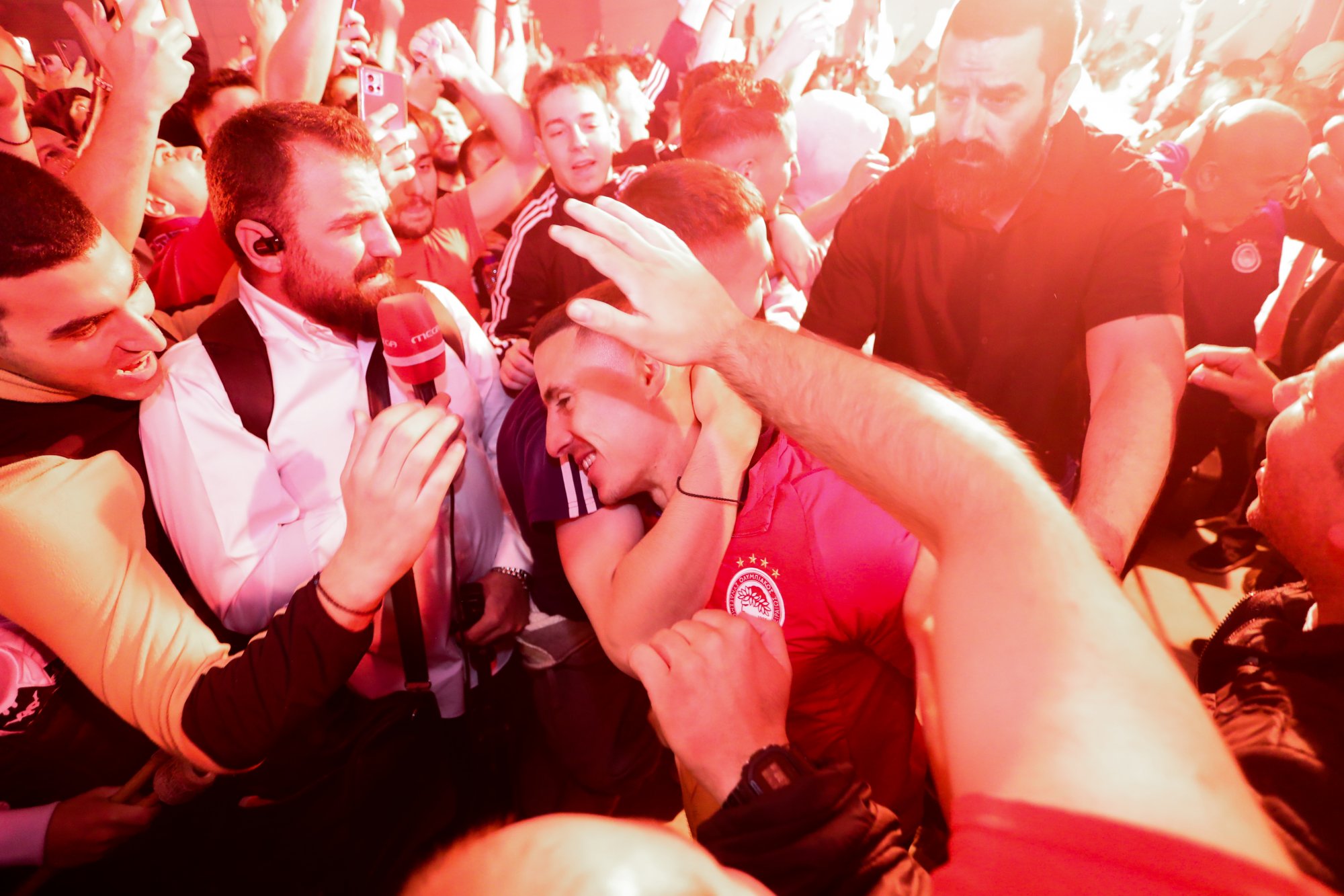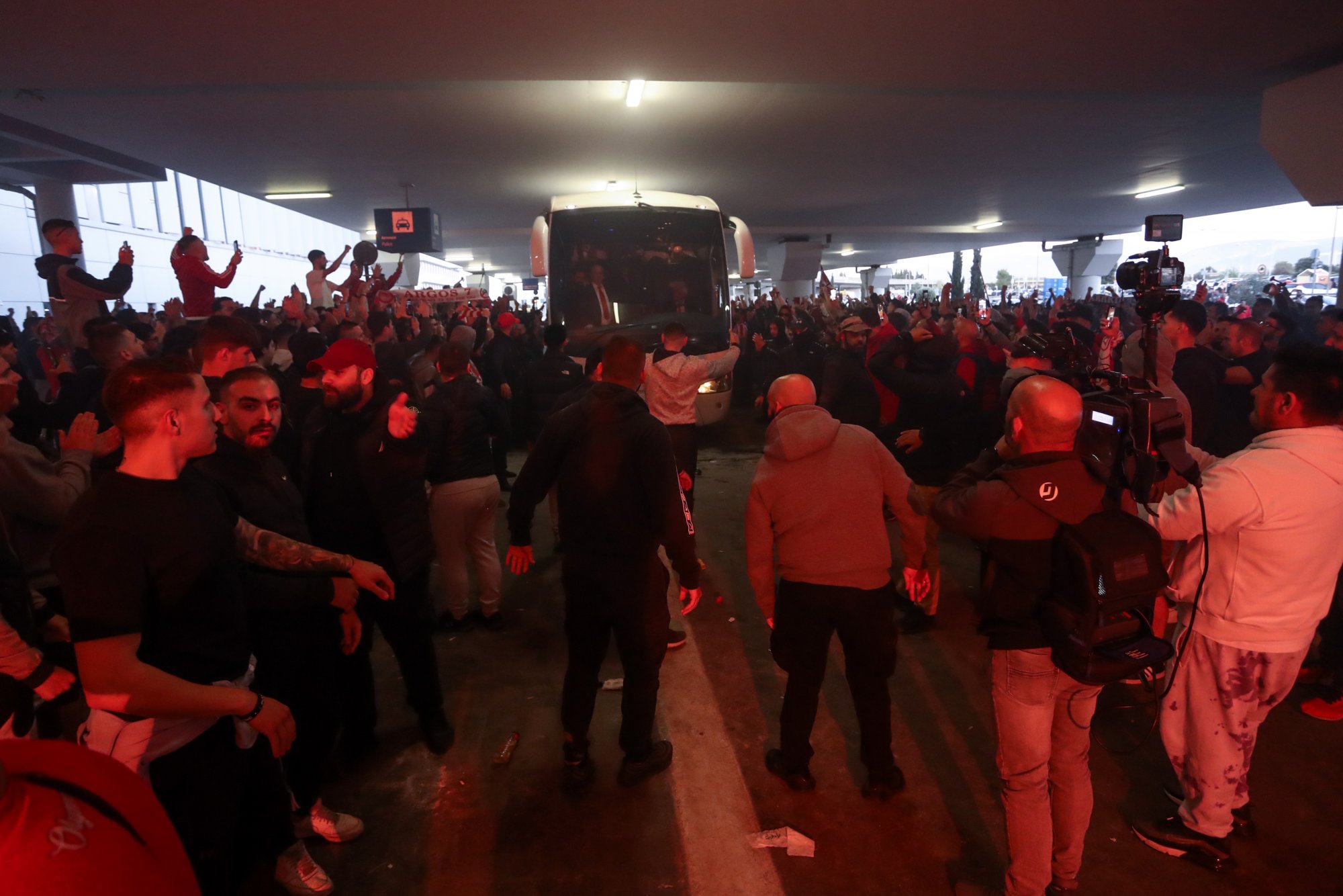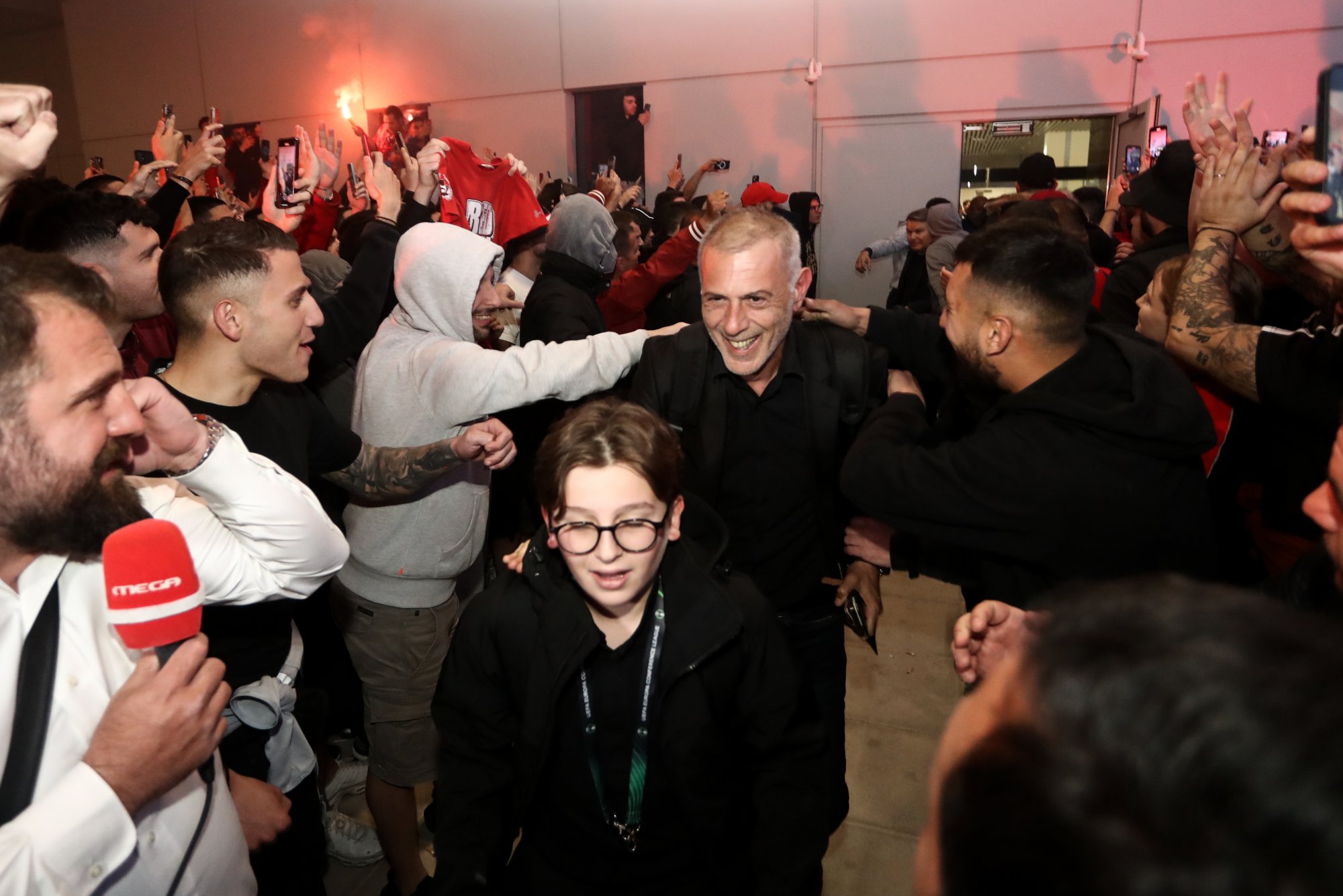 Από τις 04:00 τα ξημερώματα, πλήθος φιλάθλων του Ολυμπιακού είχαν κατακλύσει τον εξωτερικό χώρο του αεροδρομίου επιφυλάσσοντας μια καυτή ατμόσφαιρα με συνθήματα, χορούς και τραγούδια στην θρυλική αποστολή που τους «έστειλε» στον έβδομο ουρανό.