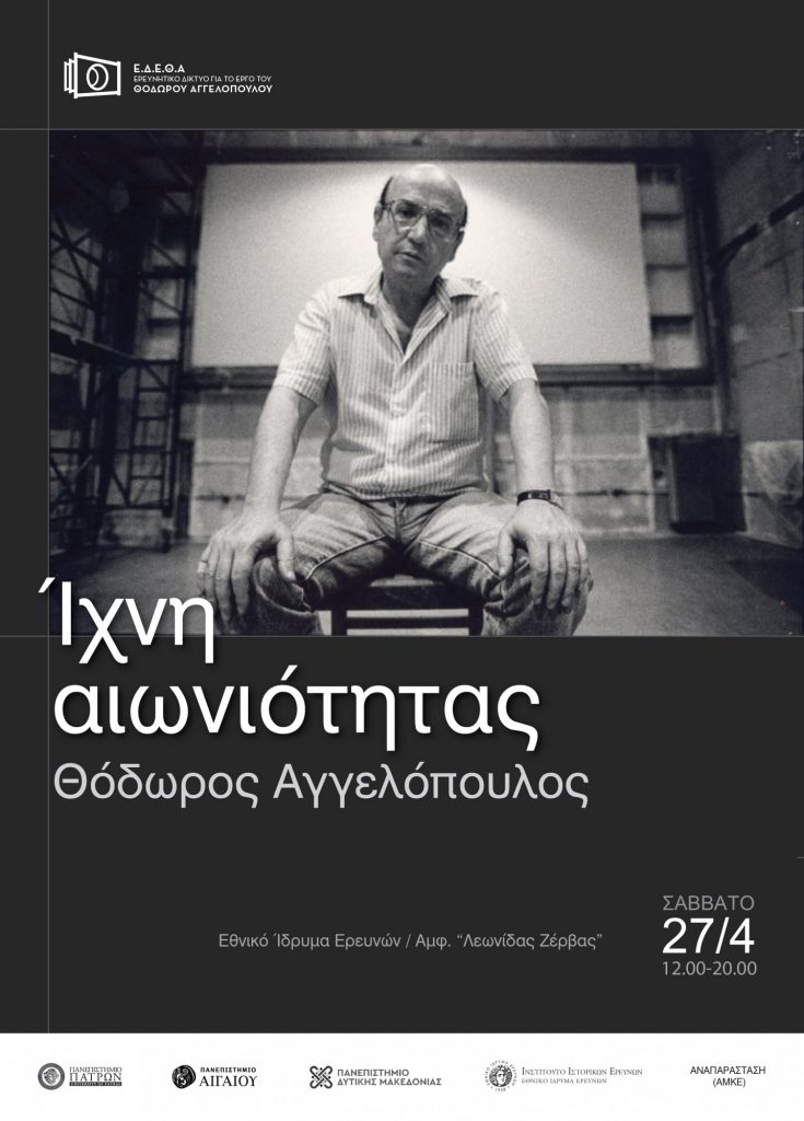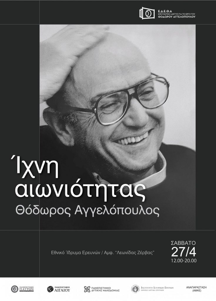 Αυτά είναι μερικά από τα ερωτήματα που θα απασχολήσουν τις συμμετέχουσες και τους συμμετέχοντες στην ημερίδα με τίτλο Ίχνη αιωνιότητας: Θόδωρος Αγγελόπουλος που θα πραγματοποιηθεί το Σάββατο 27 Απριλίου στο Αμφιθέατρο «Λεωνίδας Ζέρβας» του Εθνικού Ιδρύματος Ερευνών (διόλου τυχαία η ημερομηνία της ημερίδας συμπίπτει με την ημερομηνία γέννησης του Θ. Αγγελόπουλου). Στόχος της συνάντησης είναι να διασταυρωθούν ερευνήτριες και ερευνητές που ασχολούνται με το έργο του Θόδωρου Αγγελόπουλου με τους ανθρώπους που συνεργάστηκαν μαζί του, καθώς και με τους φίλους και την οικογένειά του, σε μια παραγωγική διαδικασία που θα αναδείξει νέα ερωτήματα και προσεγγίσεις.