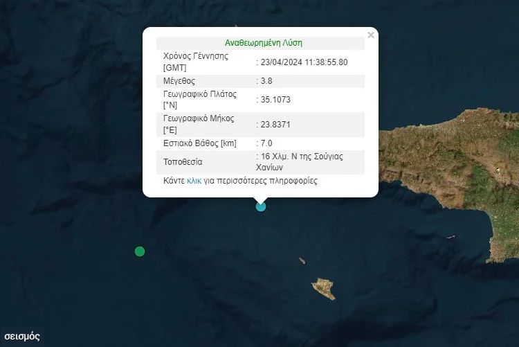 Σεισμός 3,8 Ρίχτερ σημειώθηκε ανοιχτά των Χανίων, στην Κρήτη.