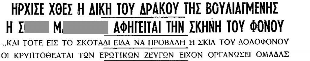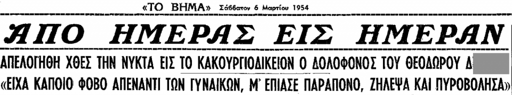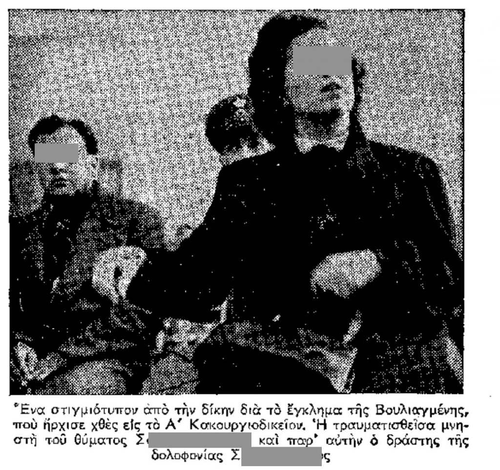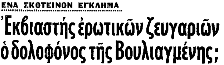 «Υπό των οργάνων της Χωροφυλακής, είχε συλληφθή προτινος ένας υπόπτος από τους διεστραμμένους εκείνους τύπους, οι οποίοι παρηκολούθουν εκ συστήματος τας ερωτικάς περιπτύξεις των συχναζόντων εις την περιοχήν της Βουλιαγμένης ζευγών».