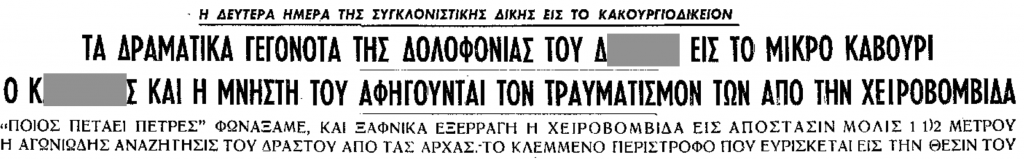 »Mε έπιασε από την μέση και προσπάθησε να μ’ ανασηκώση αλλά δεν μπόρεσε. Του είπα να φωνάξη να έρθουν να μας βοηθήσουν. Εκείνος δεν απάντησε, πήρε την τσάντα μου και έφυγε. Μετά ήρθαν οι άλλοι. Είχα τραυματισθή στο κεφάλι και στην σπονδυλική στήλη. Πενήντα μέρες πάλαιψα με τον θάνατο στο νοσοκομείο. Ακόμα κρατιέμαι με ενέσεις. (…)