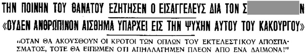 »Την 1.30 πρωινήν εξεδόθη η απόφασις του Κακουργιοδικείου (…) . Το Δικαστήριον των συνέδρων επέβαλεν εις αυτόν βάσει της ετυμηγορίας των ενόρκων την ποινήν του θανάτου διά τον φόνον του Δέγλερη και την ποινήν των 24 ετών καθείρξεως κατά συγχώνευσιν δι όλα τα λοιπά αδικήματα (τραυματισμός Μανωλάκη, κλοπή τσάντας, ωρολογίου, οπλοχρησία, παράνομος οπλοφορία, προμελετημένα τραύματα εις βάρος Καραγιώργη κ.λ.π.)».