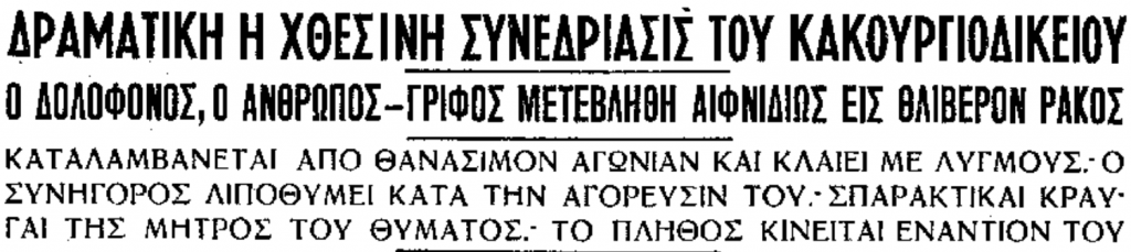 »Ήρχισε να φοβήται διά την ζωήν του και έρριπτε τρομαγμένα βλέμματα γύρω του. Εχρειάσθη πολλής ώρας προσπάθεια της χωροφυλακής διά να αποκατασταθή η τάξις.