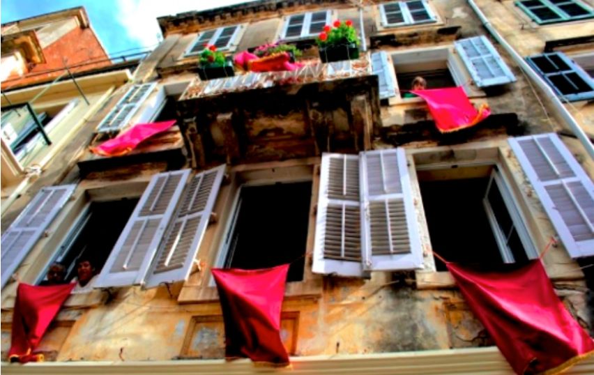 Τα παράθυρα και τα μπαλκόνια των Κερκυραίων σήμερα, Κυριακή των Βαΐων, είναι στολισμένα με τα κόκκινα πορφυρά «δαμάσκο», που προσδίδουν τιμή και επισημότητα στην ημέρα, γιατί πραγματοποιείται, η μεγαλόπρεπη λιτάνευση του Ιερού σκηνώματος του Αγίου Σπυρίδωνα, σε ανάμνηση του θαύματος της απαλλαγής του νησιού, από την πανώλη στις αρχές του 17ου αιώνα.