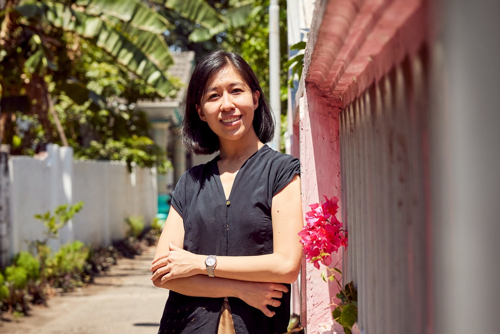 Η Denica Riadini-Flesch συνομιλεί με γυναίκες έξω από το εργαστήριο υφαντικής και ραπτικής της SukkhaCitta στην Ινδονησία.