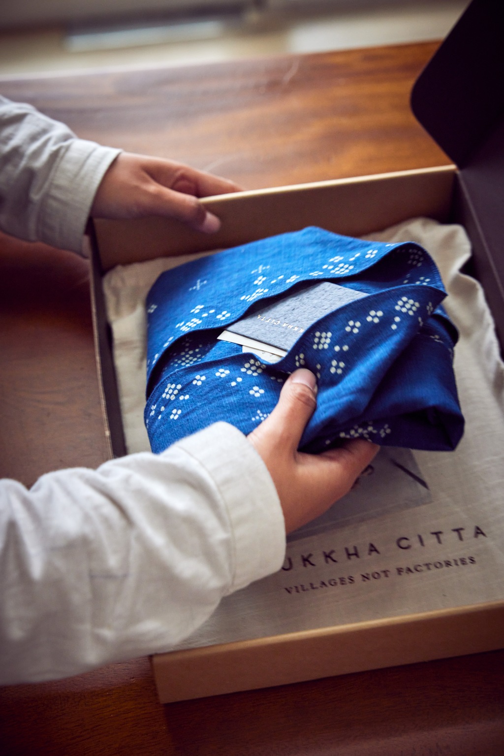 Ένα παραδοσιακό κεντημένο ρούχο της εταιρείας SukkhaCitta, που σημαίνει «ευτυχία», έτοιμο προς αποστολή.