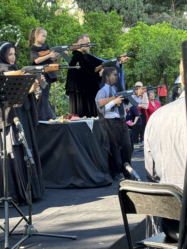 Ήταν εντυπωσιακή η στιγμή στον Κήπο του Προεδρικού Μεγάρου, όταν μικρά κορίτσια από την Ουκρανία, μαθήτριες σε σχολείο της Αθήνας, ξεδίπλωσαν ξαφνικά τα καλάσνικωφ και πιστόλια (ρέπλικες βέβαια). Και έμειναν «σημαδεύοντας» αρκετή ώρα.