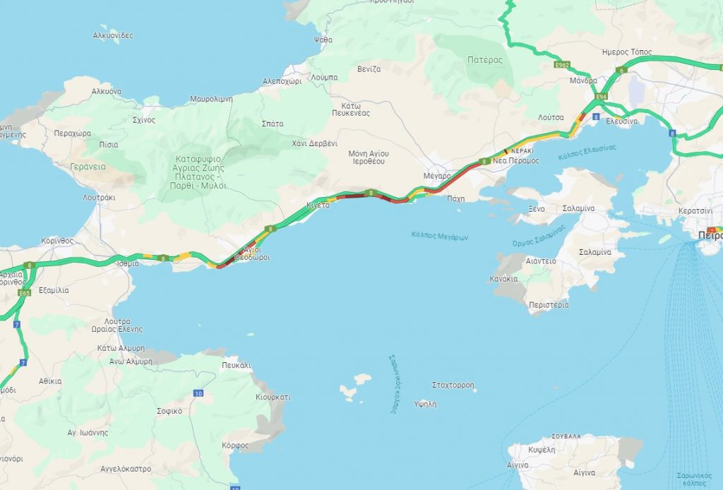 Ειδικότερα, με πολύ χαμηλές ταχύτητες κινούνται τα οχήματα από τα διόδια του Ισθμού μέχρι τους Αγίους Θεοδώρους, ενώ μεγάλες καθυστερήσεις παρατηρούνται στο ύψος της Κινέττας και των Μεγάρων.