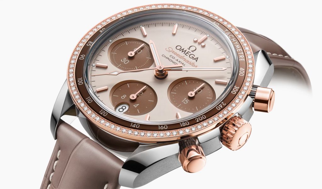 OMEGA Speedmaster 38 από ανοξείδωτο ατσάλι και κίτρινο χρυσό 18K με ασημί ιριδίζον καντράν και πράσινο δερμάτινο λουράκι (τιμή: €8.600) και φυσικά το πολύ δημοφιλές Speedmaster 38 “Cappuccino” από ανοξείδωτο ατσάλι και χρυσό Sedna™ 18K Gold με καφέ δερμάτινο λουράκι (τιμή: €8.600).