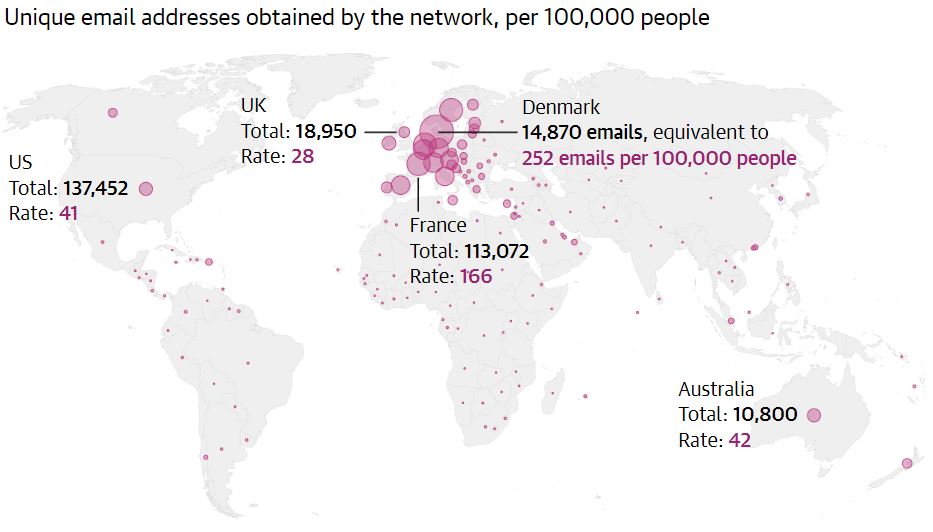 Μέχρι στιγμής, εκτιμάται ότι 800.000 άνθρωποι, η συντριπτική πλειονότητα των οποίων είναι από την Ευρώπη και τις ΗΠΑ, έχουν κοινοποιήσει το e-mail τους, ενώ 476.000 εξ αυτών έχουν δώσει στοιχεία της χρεωστικής ή πιστωτικής τους κάρτας, συμπεριλαμβανομένου του τριψήφιου κωδικού ασφαλείας που αυτές διαθέτουν. Οι απατεώνες κατάφεραν να κρατήσουν παράλληλα, ονόματα, e-mails, καθώς και τους ταχυδρομικούς κώδικες των θυμάτων τους.