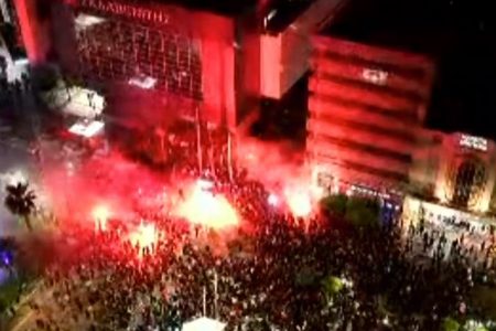 Οι φίλοι του Ολυμπιακού έχουν ξεχυθεί στους δρόμους πανηγυρίζοντας με συνθήματα και βεγγαλικά.