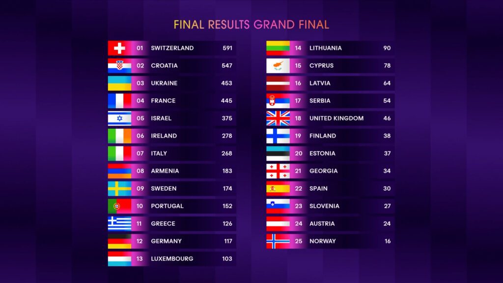 Με 591 βαθμούς η Ελβετία με το Nemo και το The Code αναδείχθηκε η μεγάλη νικήτρια του φετινού διαγωνισμού της Eurovision.