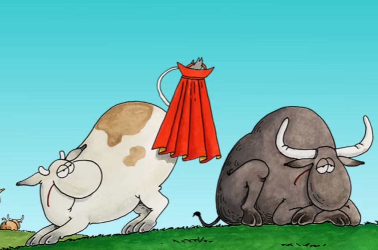 Η αγελάδα κουνά ένα κόκκινο πανί με την ουρά της και αναρωτιέται μιλώντας στον ταύρο γιατί δεν της λέει ποτέ να κάνουν έρωτα. Εκείνος απαντά γιατί φοβάται μήπως το δεχθεί.