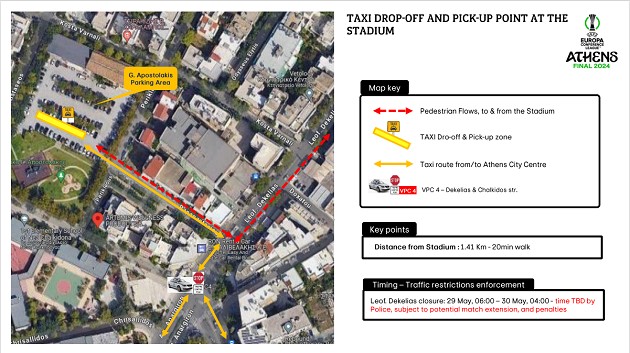 • Πέραν των διαπιστευμένων οχημάτων, κανένα άλλο όχημα δεν θα έχει πρόσβαση στο γήπεδο και δεν θα μπορεί να προσεγγίσει τις οδούς με κόκκινο στο χάρτη (το γενικό σχέδιο το οποίο θα εξειδικευτεί τις επόμενες ημέρες). Επομένως η προσέγγιση θα πρέπει να γίνει με τα μέσα μαζικής μεταφοράς και ταξί, τα οποία θα έχουν συγκεκριμένα σημεία αποβίβασης και παραλαβής, όπως φαίνεται στους χάρτες που ακολουθούν.
