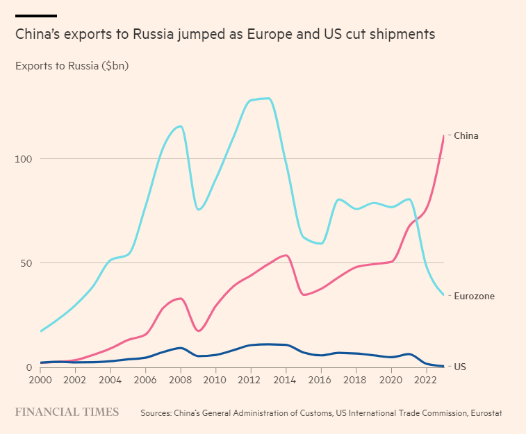 Το 2023, το 60% των εισαγωγών της Ρωσίας σε αγαθά υψηλής τεχνολογίας διπλής χρήσης, όπως ορίζονται από τους εμπορικούς κανονισμούς της ΕΕ, προέρχονταν από την Κίνα, σύμφωνα με την ανάλυση των ρωσικών εμπορικών δεδομένων της FT.