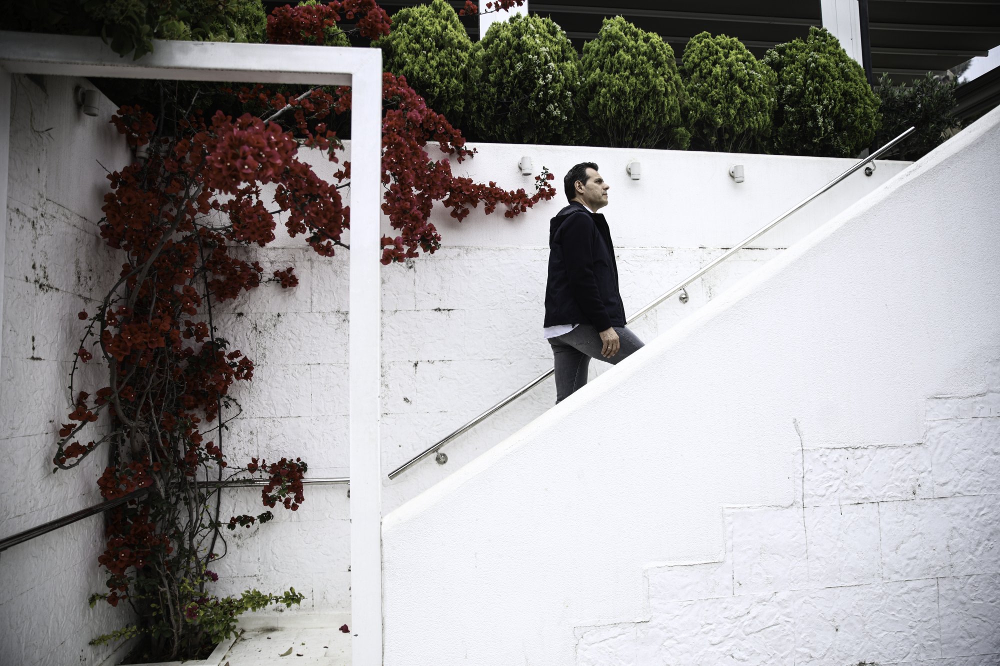 Με τη σιλουέτα του να προβάλει από τα λευκά σκαλιά, ο Δημήτρης Ιτούδης γνέφει προς το μέρος μας. Μας χαιρετά εξ αποστάσεως και ζητά ευγενικά μερικά λεπτά για να ολοκληρώσει το τηλεφώνημά του. Πηγαίνει παράμερα, κάθεται σ’ ένα τραπεζάκι προς την τζαμαρία και συνεχίζει τη σύντομη συνομιλία του.