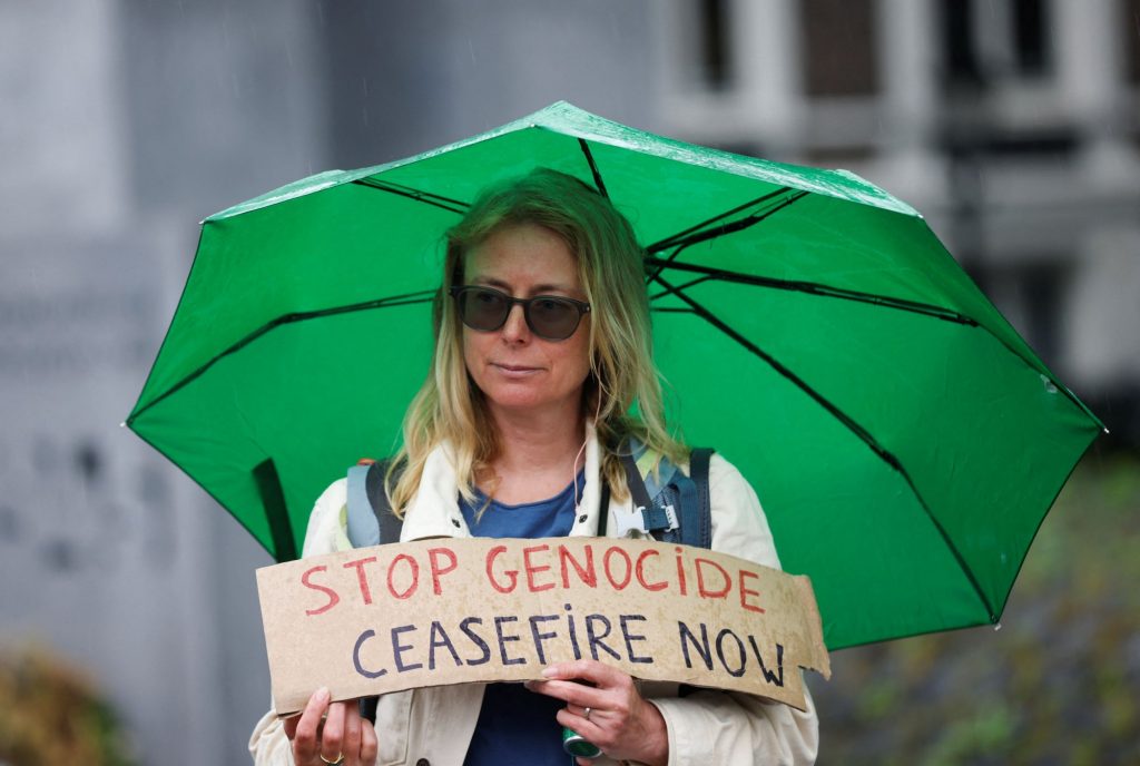 Έξω από την έδρα του δικαστηρίου, είχε συγκεντρωθεί μία μικρή ομάδα φιλοπαλαιστίνιων διαδηλωτών που κρατούσαν σημαίες και έπαιζαν μουσική ραπ, φωνάζοντας συνθήματα υπέρ της ελεύθερης Παλαιστίνης.
