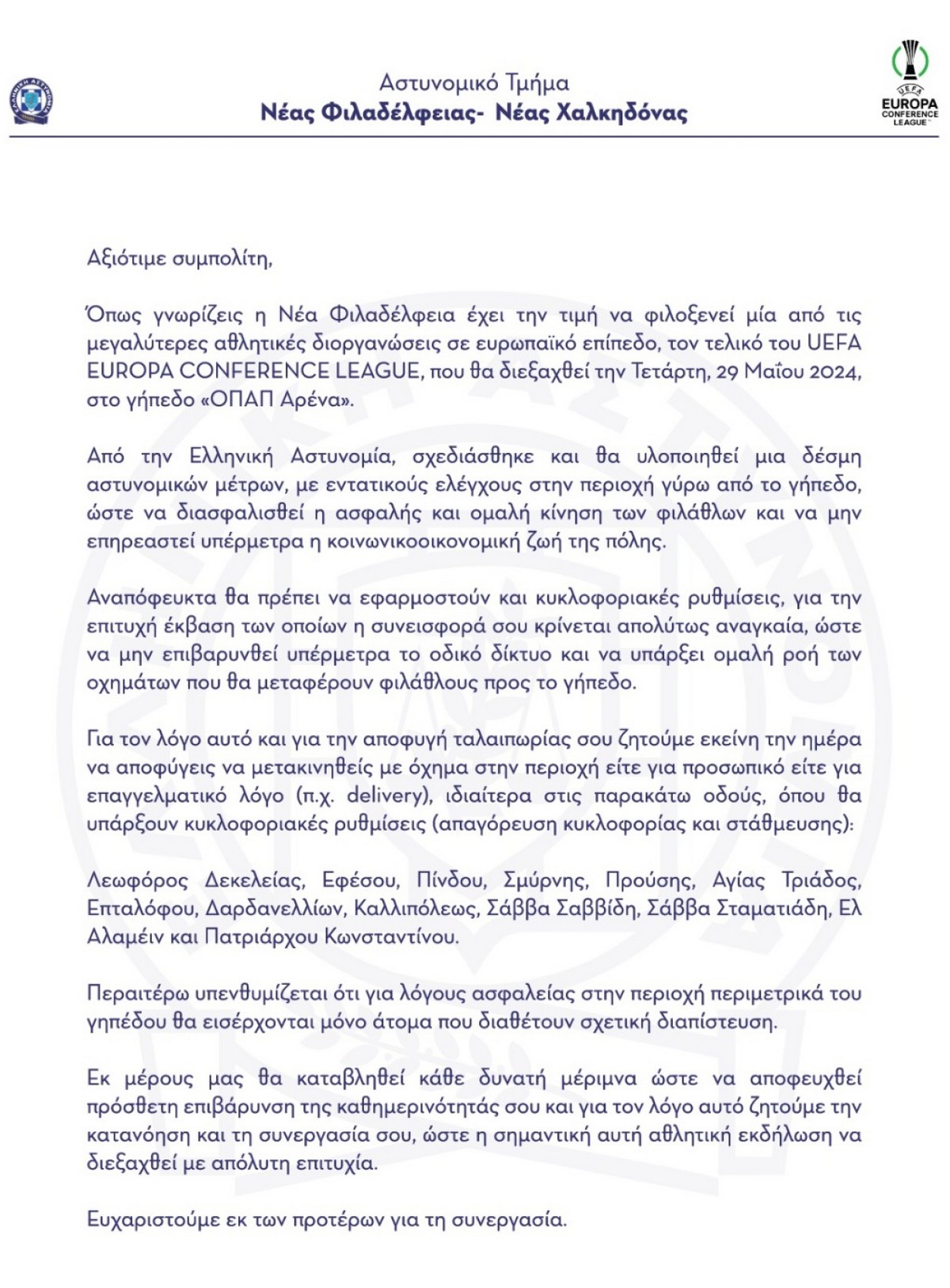 Ενόψει του τελικού UEFA Europa Conference League μεταξύ των ομάδων «Ολυμπιακός – Φιορεντίνα», που θα διεξαχθεί την Τετάρτη, 29 Μαΐου 2024, στο γήπεδο «ΟΠΑΠ Αρένα» στη Νέα Φιλαδέλφεια, από την Ελληνική Αστυνομία και τη διοργανώτρια Αρχή συναποφασίστηκε λήψη αυστηρών και εντατικών μέτρων ελέγχου και πρόληψης, καθώς και κυκλοφοριακές ρυθμίσεις στη γύρω περιοχή για την ασφαλή και ομαλή κίνηση φιλάθλων και πολιτών.