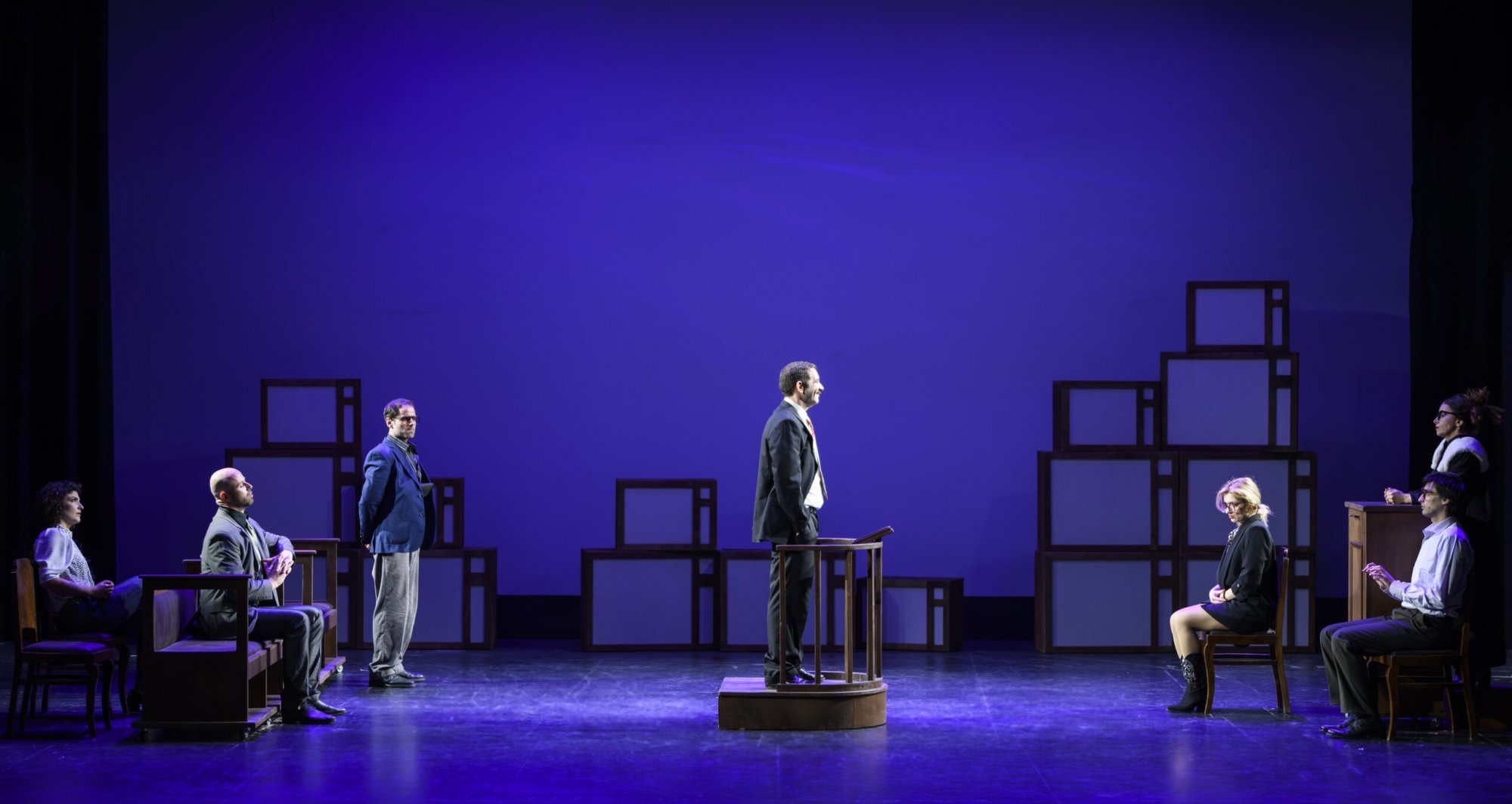 Μέχρι που δίνεται εντολή άνωθεν για την σύλληψή του κατ’ επάγγελμα και συνήθεια κομπιναδόρου και ξεκινά μια πολύκροτη δίκη, στην οποία προσέρχεται πλήθος μαρτύρων. Ο μίτος της ιστορίας θα ξετυλιχθεί πόντο-πόντο επί σκηνής ακολουθώντας τις μαρτυρίες, που δεν φθάνουν στο ακροατήριο απαραίτητα με χρονολογική σειρά. Αυτό από μόνο του δίνει στην αφήγηση δομή πιο κινηματογραφική.