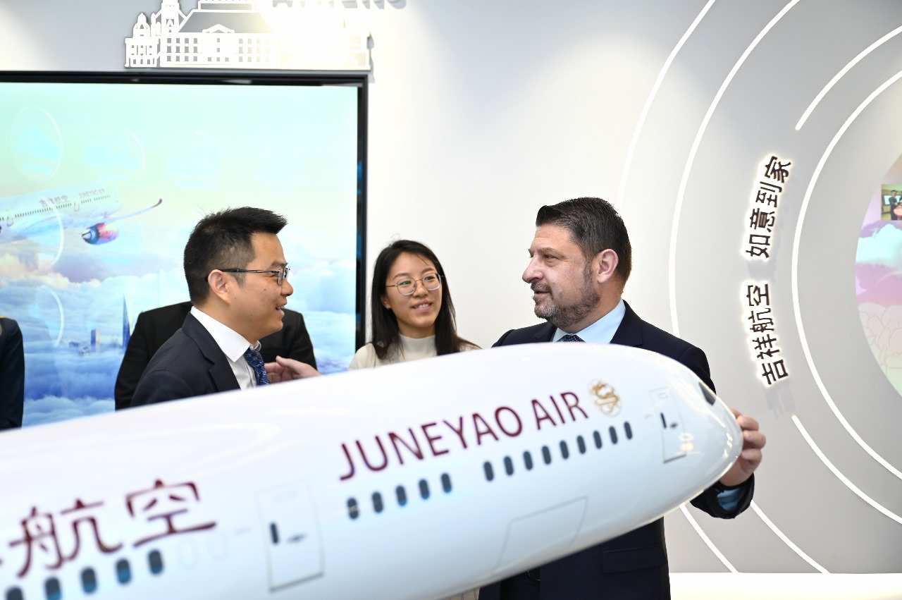 Ο Γενικός Διευθυντής της Juneyao Airways χάρισε στον Περιφερειάρχη ένα ομοίωμα του Boeing 787-8 Dreamliner, του ολοκαίνουριου αεροσκάφους που χρησιμοποιεί η εταιρεία για την απευθείας σύνδεση της Αθήνας με τη Σαγκάη, τρεις φορές την εβδομάδα.