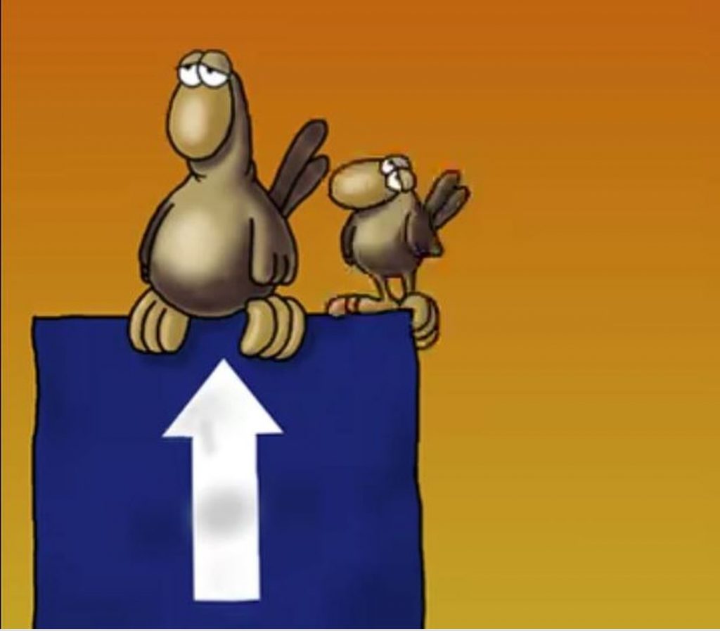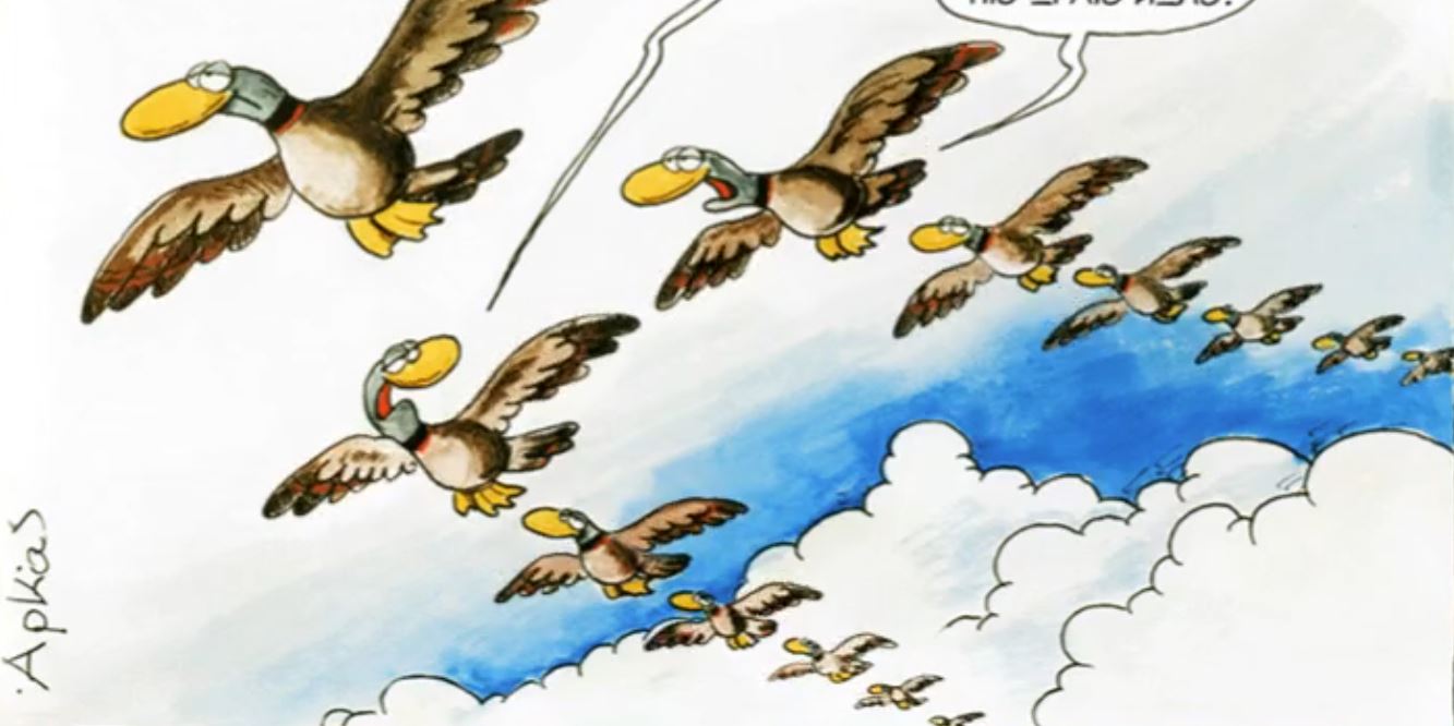 Στο σκίτσο με το οποίο μας καλημερίζει σήμερα, εικονογραφεί ένα σμήνος από πτηνά – πιθανότατα πάπιες – σε σχηματισμό και ο διάλογος μεταξύ δύο από αυτών είναι σίγουρο ότι άλλους θα τους κάνει να γελάσουν αλλά πολλούς άλλους όχι, καθώς θα μπορούσε να χαρακτηριστεί και ως σεξιστικός.