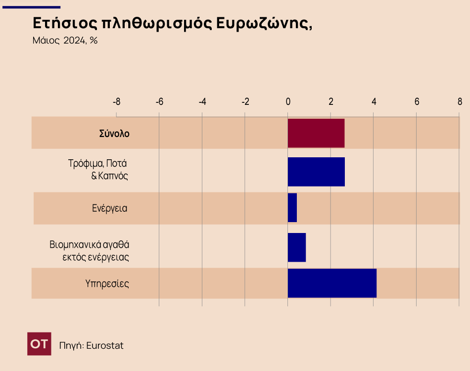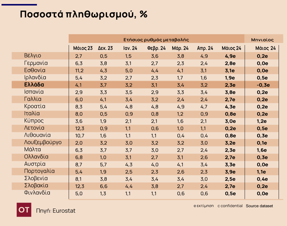 Τον Απρίλιο, ο πληθωρισμός είχε μειωθεί στην Ελλάδα στο 3,2% από 3,4% τον Μάρτιο, ενώ στην Ευρωζώνη έμεινε σταθερός στο 2,4%.