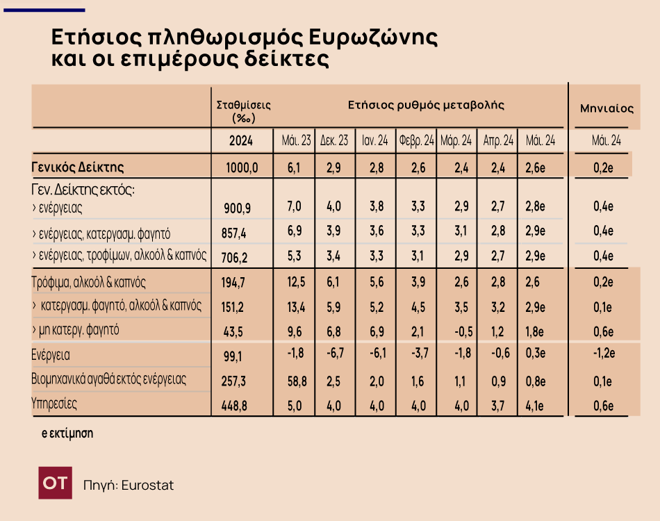 Όσον αφορά τις κύριες συνιστώσες του πληθωρισμού στη ζώνη του ευρώ, οι υπηρεσίες αναμένεται να έχουν τον υψηλότερο ετήσιο ρυθμό τον Μάιο (4,1%, έναντι 3,7% τον Απρίλιο), ακολουθούμενες από τα τρόφιμα, το αλκοόλ και τον καπνό (2,6%, έναντι 2,8% τον Απρίλιο), τα μη ενεργειακά βιομηχανικά αγαθά (0,8%, έναντι 0,9% τον Απρίλιο) και την ενέργεια (0,3%, έναντι -0,6% τον Απρίλιο).