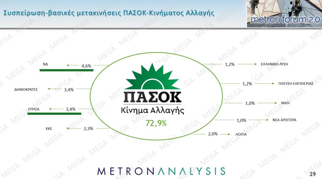Υπό άλλες συνθήκες επίσης το ΠαΣοΚ δεν θα εμφάνιζε αριθμητικές απώλειες που θα άγγιζαν το 5% προς τη ΝΔ (4.6%) και θα ξεπερνούσαν το 3% προς τον ΣΥΡΙΖΑ ( 3.4%).