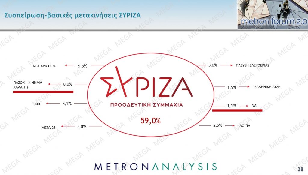 Του ΣΥΡΙΖΑ το δυσεπίλυτο πρόβλημα παραμένει η μόνιμη διαρροή ψήφων προς τη Νέα Αριστερά που κυμαίνεται σταθερά στο όριο του 10%. Σίγουρα όμως δεν περνά απαρατήρητο το 8% που φεύγει από την Κουμουνδούρου για τη Χαρ. Τρικούπη. Άλλο ένα, όχι αμελητέο, 10% κατευθύνεται δε σε ΚΚΕ (5.1%) και ΜέΡα25 (5.0%). Κοινώς, κάμποσοι πιστεύουν ότι το νέο κόμμα έχει στρίψει το τιμόνι δεξιόστροφα.