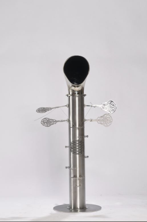 «Ανάμεσα στο φουγάρα της έκθεσης, ξεχωρίζει το Μνήμα της Μνήμης, ένας λευκός σωληνοειδής πύργος που καταλήγει σε δώδεκα κόρνες. Το έργο είναι μια μεταφορική πρόκληση για τον θεατή, ο οποίος καλείται να ανέβει νοερά τις σκάλες για να εξερευνήσει την αρχιτεκτονική που συγχωνεύεται με την ακουστική αίσθηση.