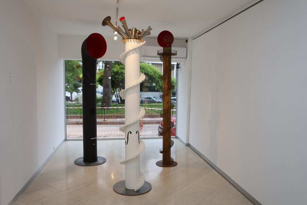 «Η νέα σειρά γλυπτών του Στέλιου είναι γυαλισμένα μεταλλικά μουσικά φουγάρα με κλειδιά και χορδές που εκπέμπουν μια παράξενα αρμονική πανδαισία ήχων ενσωματωμένη σε ειδική, για την έκθεση, μουσική σύνθεση γραμμένη από τον Ελληνοαυστραλό συνθέτη των Ολυμπιακών Αγώνων του Σύδνεϋ George Ellis. Έτοιμος περιμένει ένας λευκός σωληνωτός πύργος με ελικοειδή σκάλα που καταλήγει σε μουσικές κόρνες. Ακόμη, δύο μεταλλικές ταξιδιωτικές βαλίτσες-οθόνες με ταραχώδεις θάλασσες και ένα μπαούλο ταξιδιωτικής μνήμης, μια βάρκα με θάλασσα και μια εντυπωσιακή δίμετρη αναπαραγωγή του περίφημου πυροσβεστικού ερυθρόλευκου υδατόπυργου των 36μέτρων, εμβληματικό κτίσμα του 1953, στο Ελληνικό. Όλα, ανακαλούν το ποιητικό ταξίδι και τη μνήμη, ενσωματώνοντας την τεχνολογία και την κοινή εμπειρία της ανθρωπότητας, που συμβολίζεται από την πανταχού παρούσα θάλασσα, το νερό και τον ήχο», περιγράφει η Ντόρα Λεοντοπούλου, Ιστορικός Τέχνης – Αρχαιολόγος.
