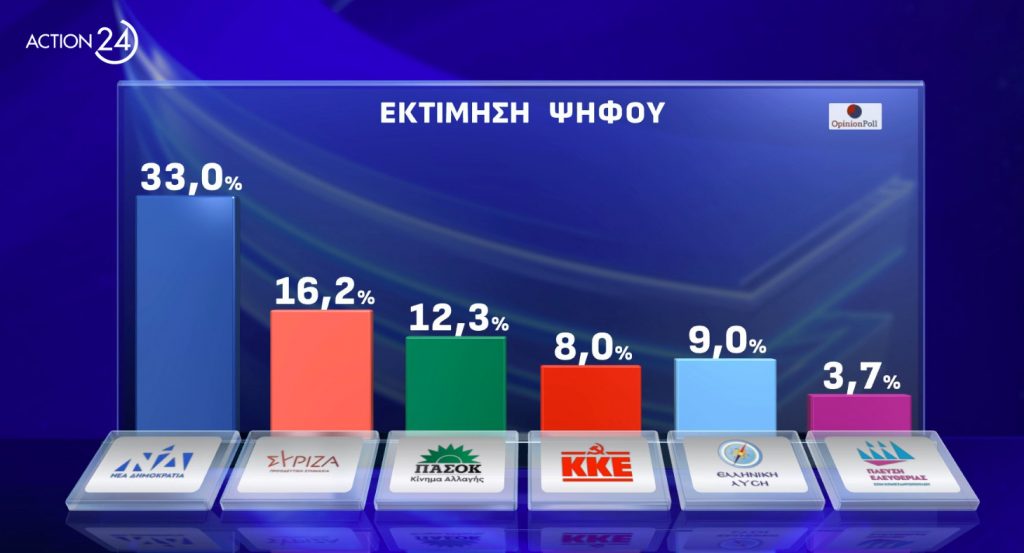 Τον στόχο του 33% που έχει θέσει για τις επικείμενες Ευρωεκλογές φαίνεται πως πιάνει η Νέα Δημοκρατία, σύμφωνα με την εκτίμηση ψήφου της νέας δημοσκόπησης της εταιρείας Opinion Poll.
