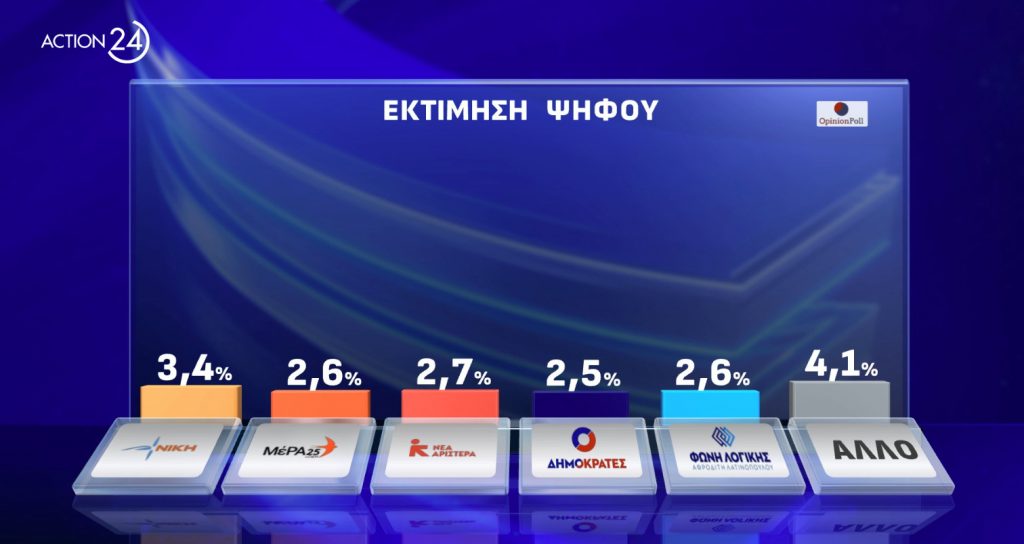 Από εκεί και πέρα υπάρχουν τέσσερα κόμματα τα οποία βρίσκονται οριακά κάτω από το όριο του 3% που απαιτείται για να εκλέξουν Ευρωβουλευτές. Συγκεκριμένα, η Νέα Αριστερά βρίσκεται στο 2,7%, το ΜέΡΑ25 στο 2,6%, η Φωνή Λογικής επίσης στο 2,6% και οι Δημοκράτες στο 2,5%.