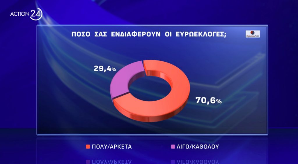 Παράλληλα, σύμφωνα με τα στοιχεία της ίδιας δημοσκόπησης, οι πολίτες δείχνουν ιδιαίτερο ενδιαφέρον για τις Ευρωεκλογές καθώς το 70,6& δηλώνει ότι ενδιαφέρεται πολύ/αρκετά για αυτές. Την ίδια ώρα το 79,9% δηλώνει ότι είναι λίγο έως καθόλου πιθανό να απέχει από τις κάλπες.