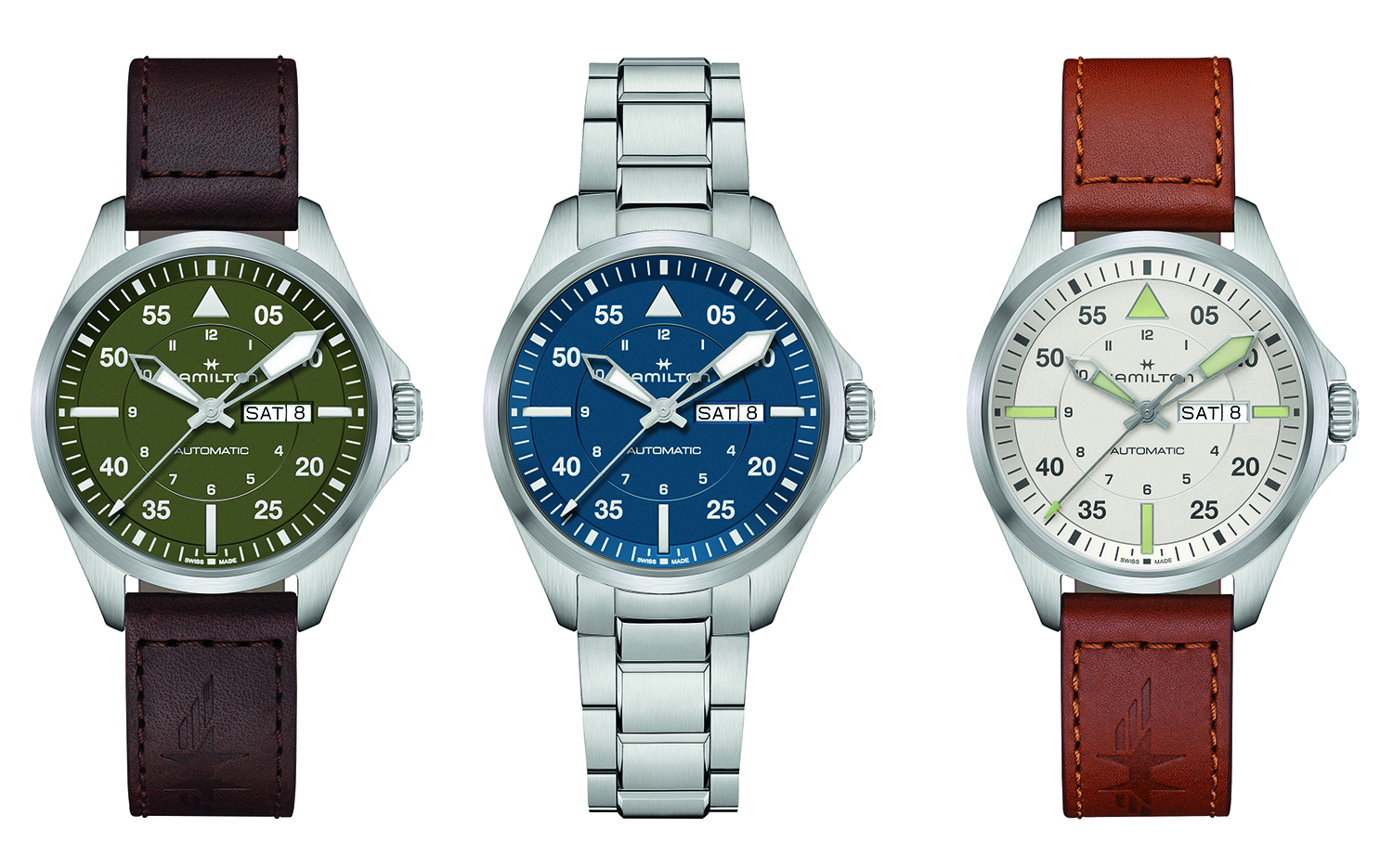 Τα τρία μοντέλα Khaki Aviation Pilot Day Date Auto έχουν κάσες διαμέτρου 42mm και πάχους 12.1mm και καντράν σε μπλε, ασημί ή λαδοπράσινο χρώμα με ένδειξη ημέρας και ημερομηνίας σε διπλό παράθυρο. Ο μηχανισμός τους είναι ο αυτόματος H-30 calibre με 80 ώρες αυτονομίας και ελατήριο Nivachron υψηλής αντίστασης στα μαγνητικά πεδία, στις κρούσεις και στις αλλαγές της θερμοκρασίας.