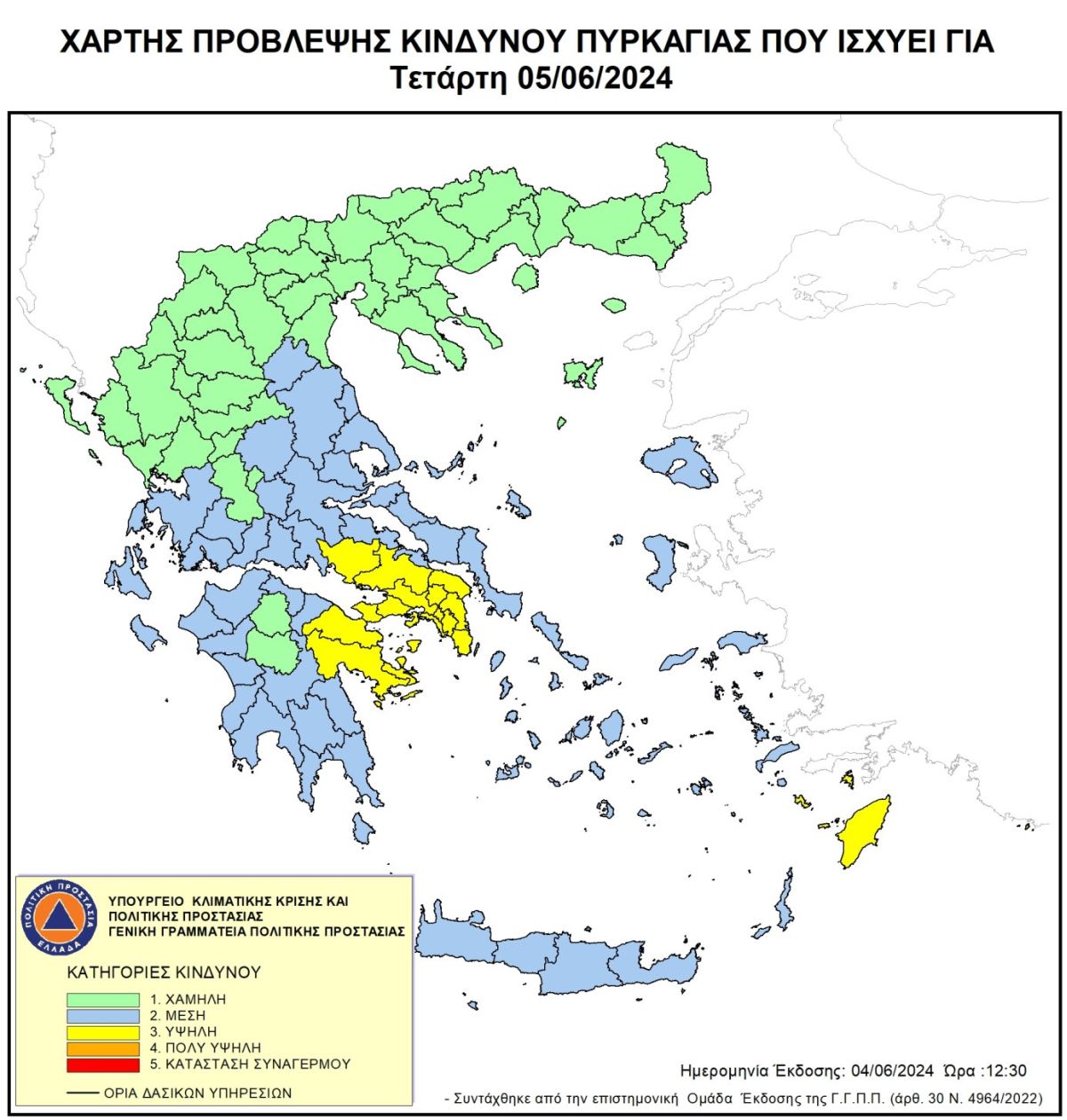 Υψηλός είναι ο κίνδυνος πυρκαγιάς αύριο Τετάρτη 5/6 σύμφωνα με τη Γενική Γραμματεία Πολιτικής Προστασίας.