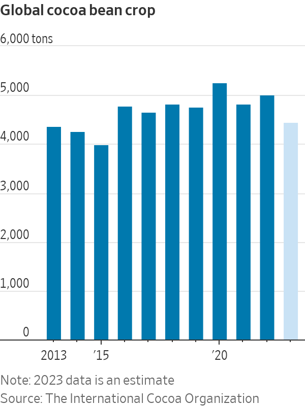 Για τους καταναλωτές, ο νόμος της ΕΕ δεν θα μπορούσε να έρθει σε χειρότερη στιγμή. Ο ασυνήθιστα ζεστός και ξηρός καιρός κατά την περίοδο των βροχών και ο υγρός καιρός κατά την ξηρή περίοδο, καθώς και οι ασθένειες των κακαόδεντρων έχουν πλήξει τις σοδειές σε όλη τη Δυτική Αφρική, την πηγή του 70% των παγκόσμιων κόκκων κακάο. Τα αποθέματα αυτή τη σεζόν αναμένεται να είναι τα χαμηλότερα των τελευταίων 45 ετών, καθώς η ζήτηση ξεπερνά την προσφορά για τέταρτη συνεχή σεζόν.