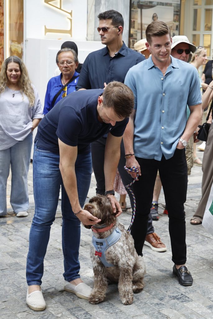 Ο κ. Κασσελάκης έφθασε με τα πόδια αφού είχε προηγουμένως περπατήσει την Ερμού συνοδευόμενος από τον σύζυγό του Τάιλερ και κρατώντας την Φάρλει.