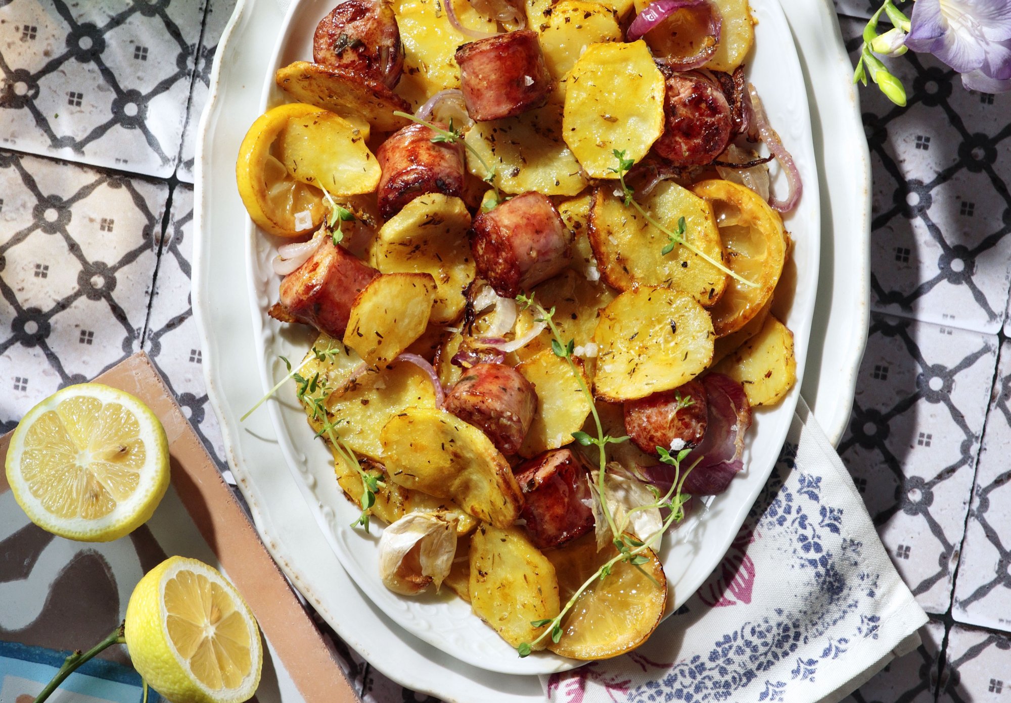 Στη συνέχεια, ανοίγουμε το καπάκι, ανακατεύουμε τις πατάτες, που έχουν πλέον μαλακώσει, και μπήγουμε ανάμεσά τους τα λουκάνικα. Κόβουμε το λεμόνι σε φέτες και το βάζουμε ενδιάμεσα.