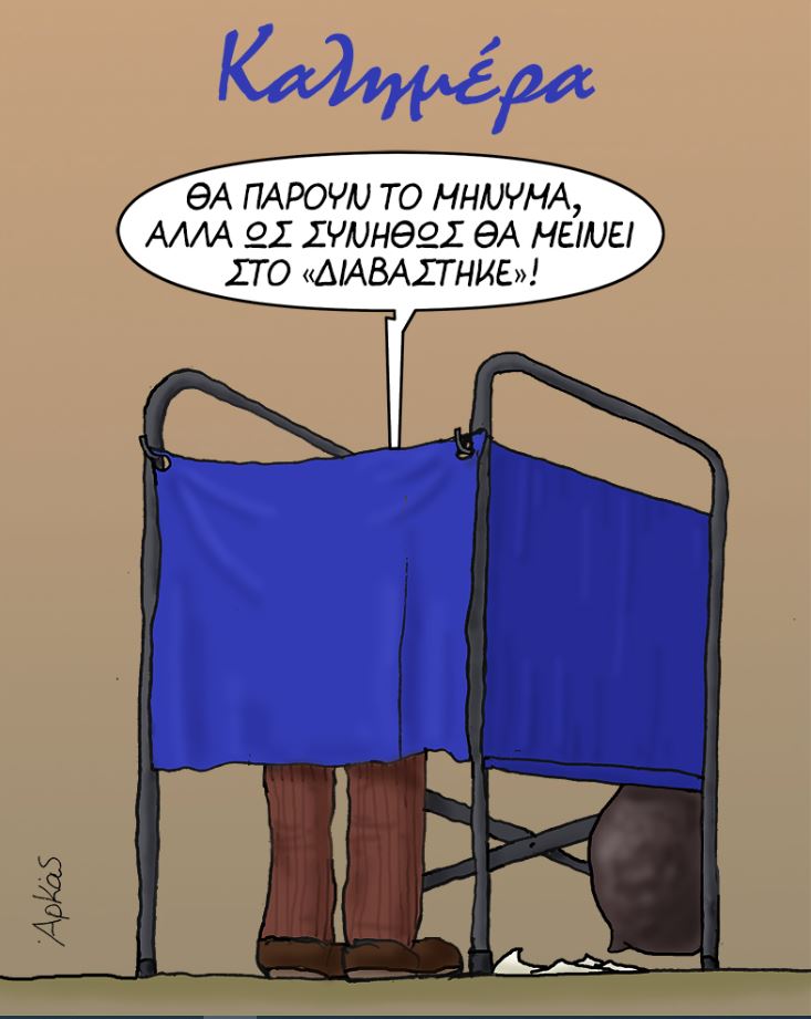 Στη σημερινή «Καλημέρα» του σκιτσάρει έναν ψηφοφόρο μέσα στο εκλογικό παραβάν που την ώρα που τοποθετεί το ψηφοδέλτιο της επιλογής του στο φάκελο για το ρίξει αμέσως μετά στην κάλπη σκέπτεται δυνατά και αμφισβητεί το ότι οι πολιτικοί λαμβάνουν υπόψιν τους το μήνυμα της κάλπης.